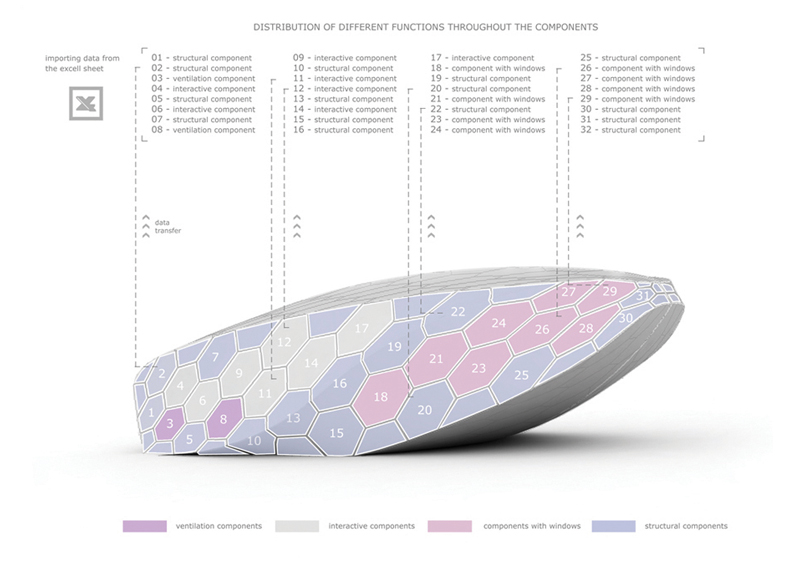 The research team was divided into 5 specialized groups exploring form finding, manufacturing techniques, structural solutions, interaction design and MEP. BIM coordination and generative procedures enabled people from different groups to work simultaneously on the design and inform each other. A component based methodology allowed us to incorporate different functions into one typology. All the pieces were initially designed to be 3D milled out of reinforced EPS foam. Final pieces (1/10 of the whole pavilion) were hot wired out of EPS foam and coated in order to become waterproof and fully structural. Some of the elements have also wooden pieces embedded.