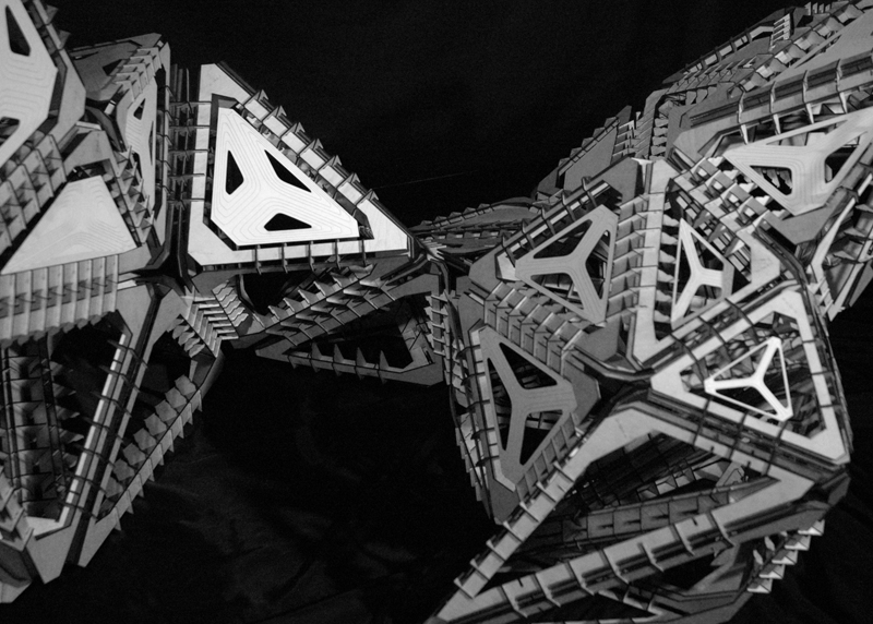 Resulting point cloud configuration became a base for component distribution. Each point in space is interpret as one of the vertices of the tetrahedron modules. Components vary in character depending on the location in space, proportions and programmatic requirement of a module.