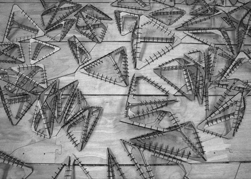 The new train station proposal creates a cross connection between the parts of the city disjoined by the railway tracks, performing in the same time as a sound barrier, activating the nearby neighbourhoods and providing a wide range of mixed-use facilities such as office, retail, leisure and cultural functions. Part of the building (shown on the picture below) was chosen for the prototype in scale 1:20, aiming to test structural and formal aspects of the project, as well as accuracy of the computational procedures and digital fabrication techniques.
