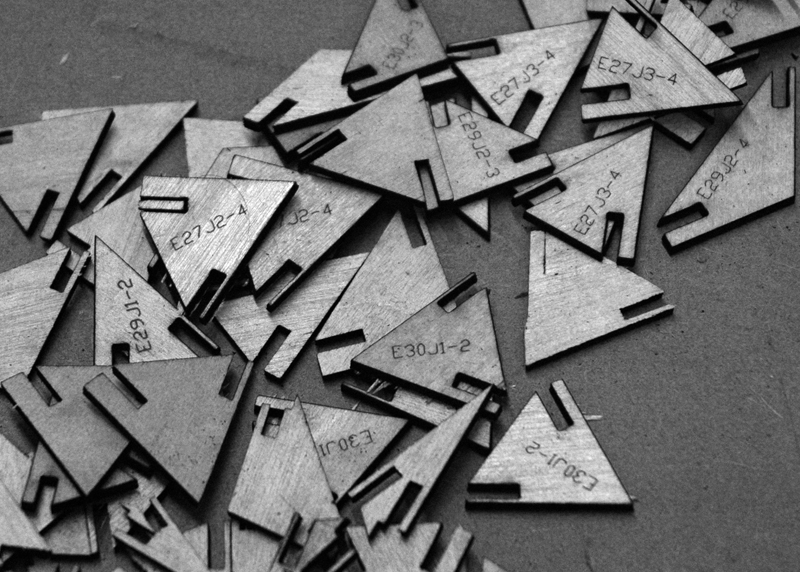 Below you can see the sequence of the fabrication and assembly process: lasercutting all the structural modules and 2 different kinds of joints, creating wooden molds for the facade elements, which were vacuum formed out of one milimeter plastic sheets, and assembly process of all the elements (total 272 faces and 2856 different connections).