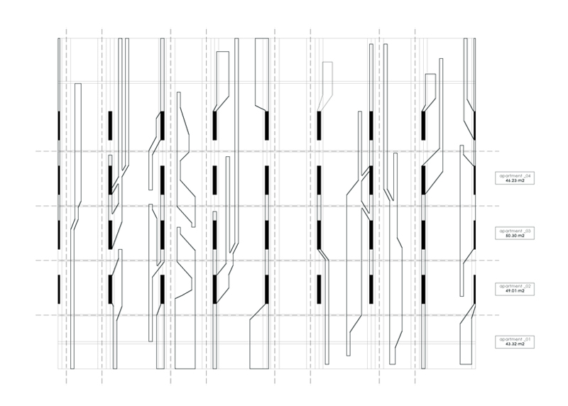 Facade perforation is generated through branching algorithm, deriving inspiration from the surrounding trees. Position of the existing openings becomes the starting point for further growth. Similar pattern reappears around the outdoor staircase, helping to blend this subtle design intervention into the surrounding forest.