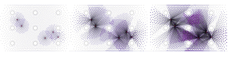 The tool was developed based on spring modelling principles in Processing with the use of the following libraries: generative design, controlP5. Given a set of obstacles imported from a txt.file, the analysis grid with chosen resolution is being distributed. As the next step, a series of strategic orientation points is being generated, serving as a base for the isovist calculation. The amount of orientation points as well as the range of a visual field can be controlled through given interface. The color code and size of the grid points corresponds to the amount of orientation points visible from that specific location.