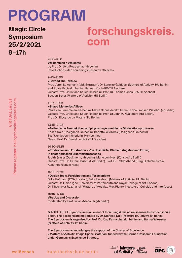 The “Magic Circle” symposium is carried out by Forschungskreis of the Weißensee Kunsthochschule berlin (khb) in cooperation with “Matters of Activity”, under the direction of Prof. Dr. Jörg Petruschat. It aims to further develop the exchange between the knowledge cultures of the natural sciences, engineering and humanities and research activities in design and the arts. For this purpose, experts from different disciplines are invited to the project presentations. They intend to provoke new perspectives and open up opportunities for cooperation. Methods of performative research are also up for discussion.