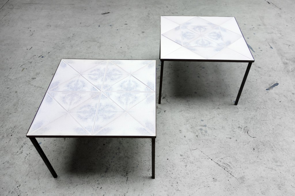 A selection of different tiles was used to create 50x50cm large plates for coffee tables. A single tile has a shape of 45°-45°-90° right triangle – half of a square, thus there are plenty of possible configurations. Below you can see two handmade tables with metal with a different tile pattern framed by thin steel structure welded by hand.