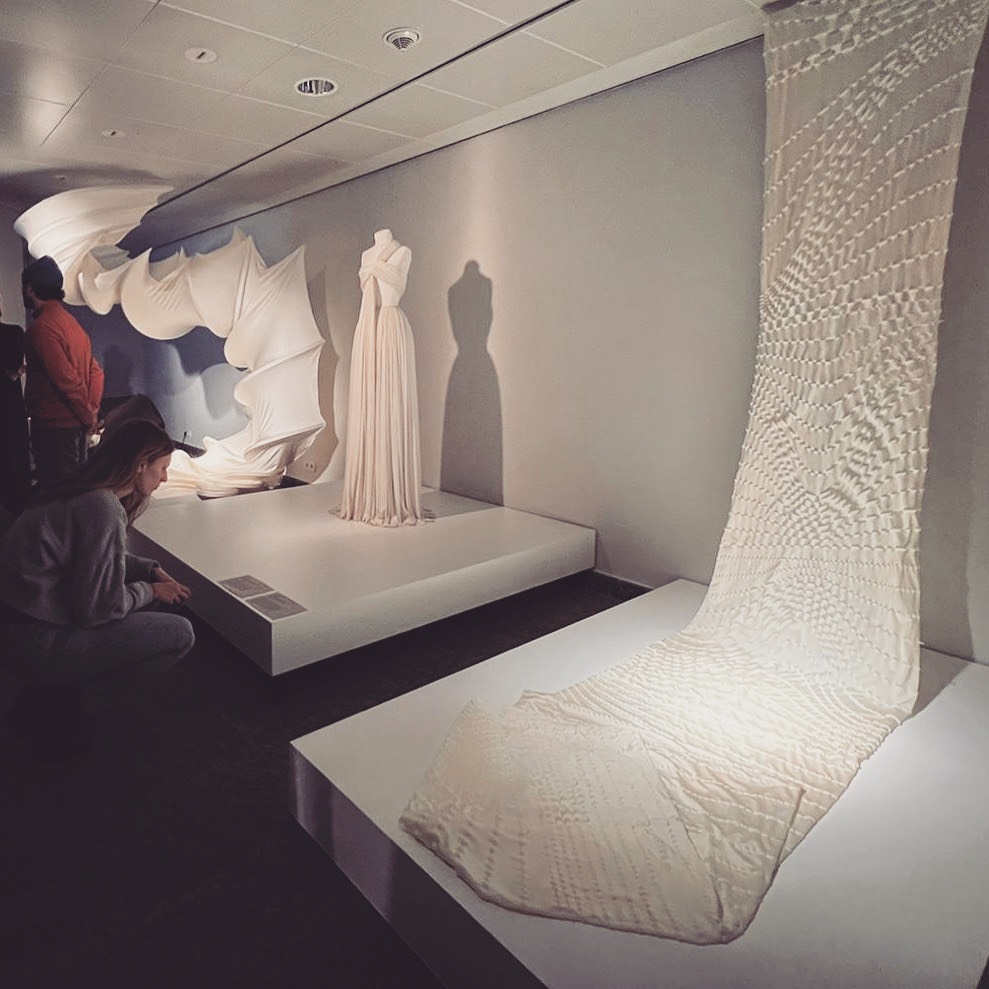 The large format prints featured in Design Lab #13: Material Legacies are both an opportunity to establish a dialogue with the spectator while constituting “fieldwork” experiments to test the efect of additional external conditions (i.e., the shaping impact of residual tensioning due to the fabric weight). Similarly, the the dress by Madame Grès stages a dialogue between pure fabric and external conditions, represented by the female body. A new perception of the female body and femininity is achieved by stripping the dress of all traditional tailoring solutions and customs. Remarkably, in both our and Madame Grès’ work, what seems “simple” conceals a much more complex phenomenon (the self-shaping of the textile as active matter) and deeper consideration of all aspects at play (light, sound, gravity, space, body, customs).