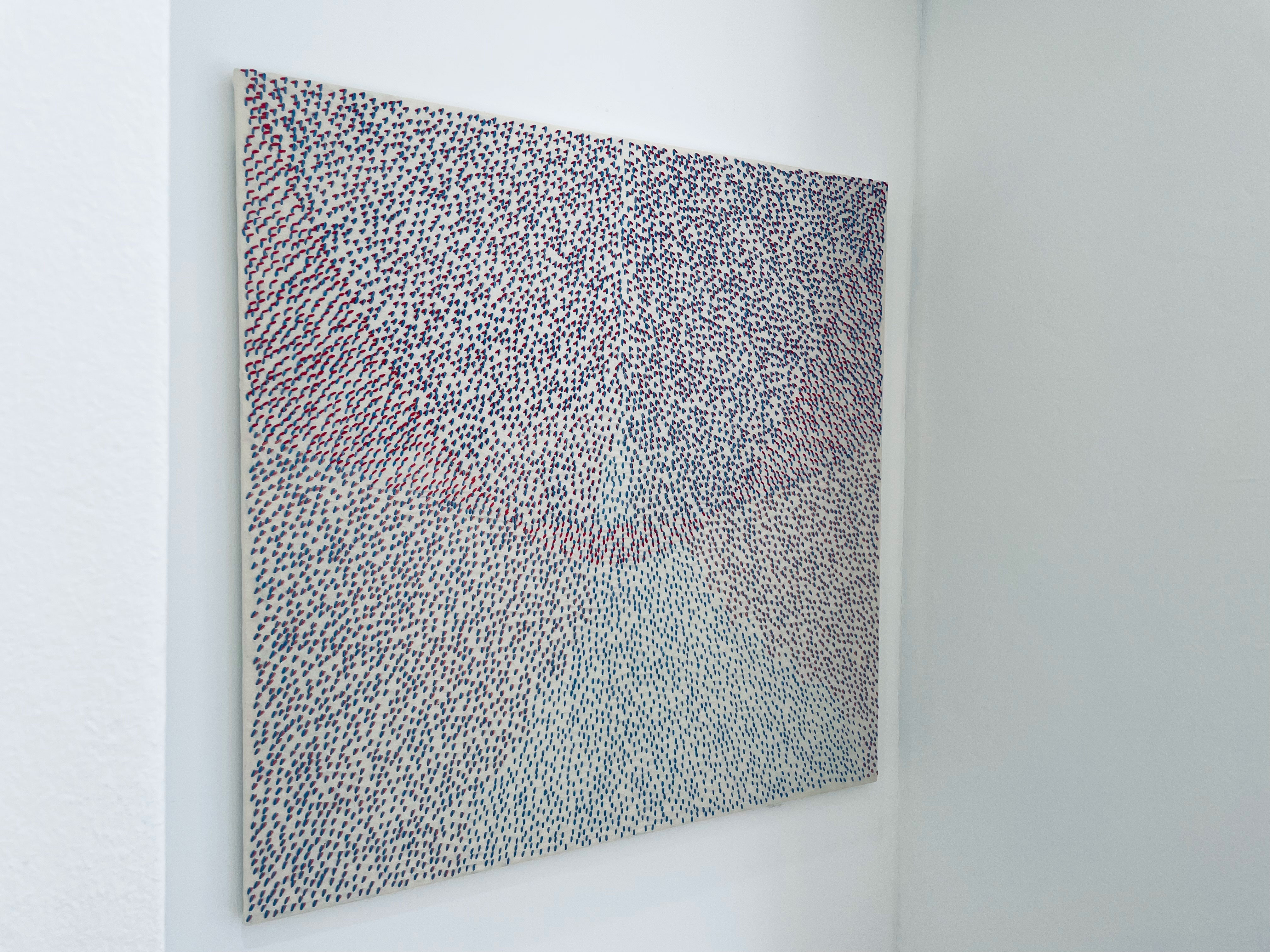Both of us share a background in architecture, yet our practices have evolved in different directions. Ute Wennrich investigated spatial structures through collages, assemblages, and object art. My own contribution focused on spatial perception and geometry, examining the relationship between digital technologies and material practices. In this body of work, I combined printmaking with painting, drawing, and embroidery, creating a dialogue between technical precision and the inherent imperfection of human craftsmanship.